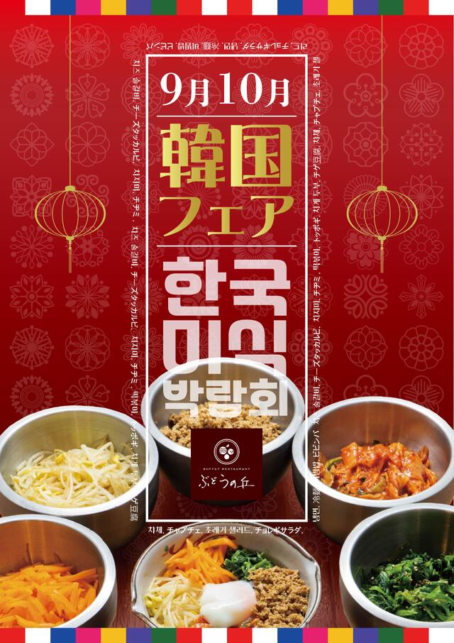 好評の韓国料理をお愉しみください♪ ●○韓国フェア○● ◆チーズタッカルビ ◆チヂミ ◆トッポギ ◆チゲ豆腐 ◆チャプチェ ◆チョレギサラダ ◆お好み具材で冷麺、ビビンバ …and more 最新の情報はぶどうの丘 Instagram公式アカウントからご覧下さい。 お席のご予約はコチラ